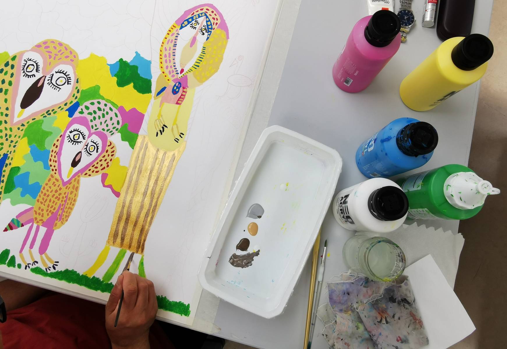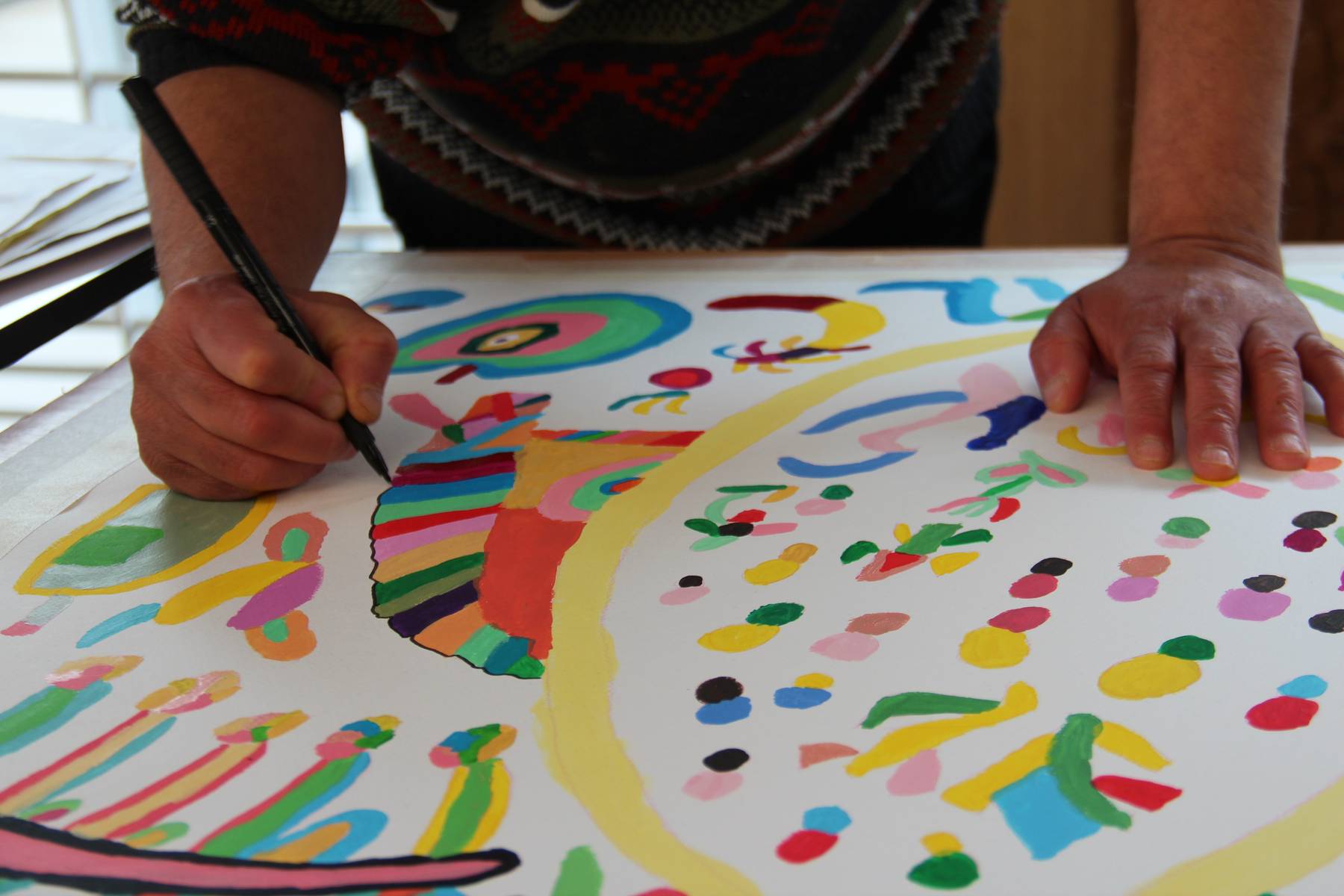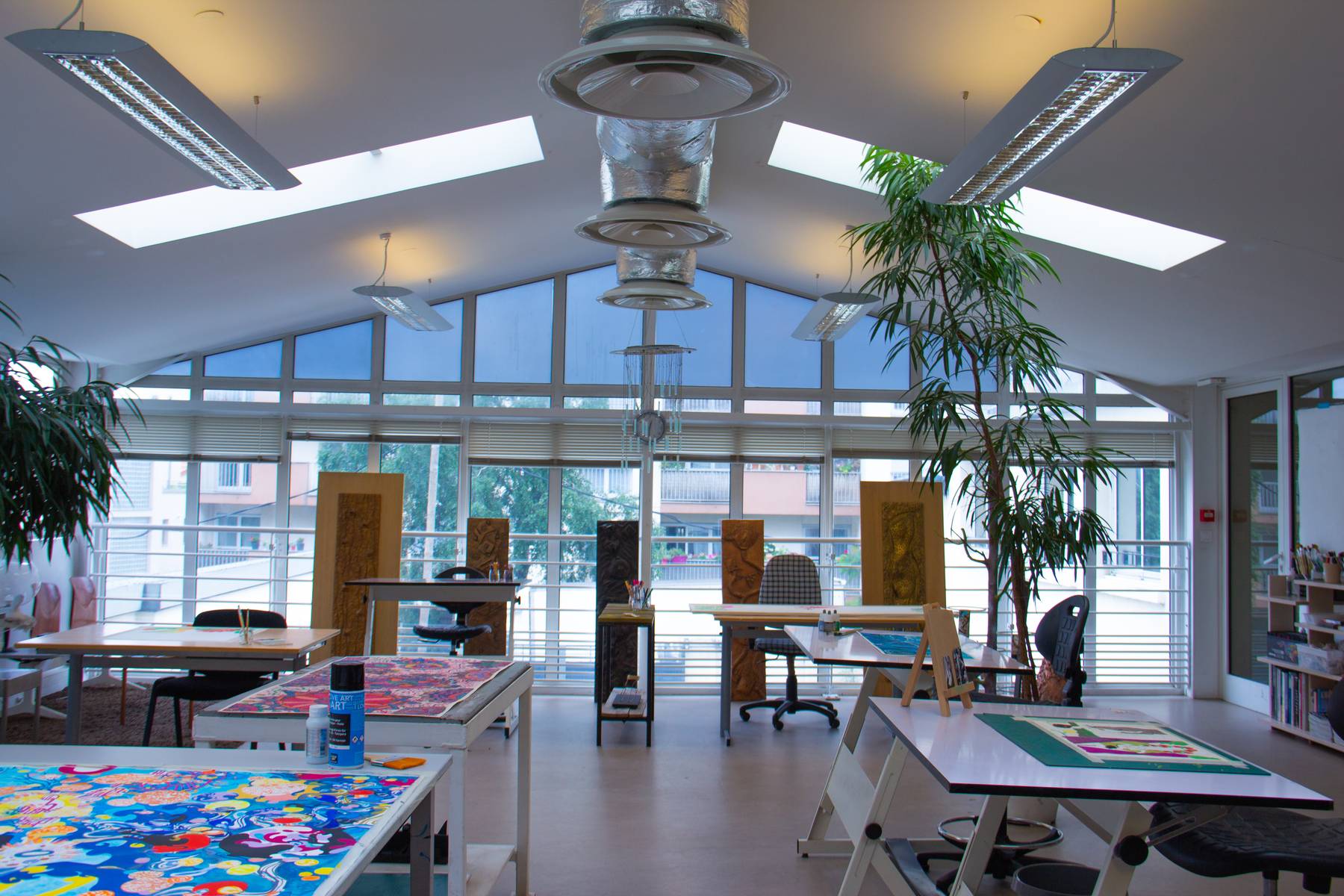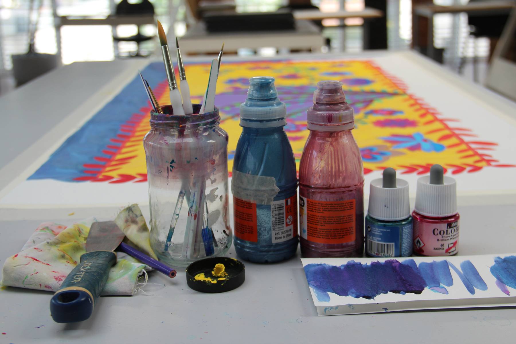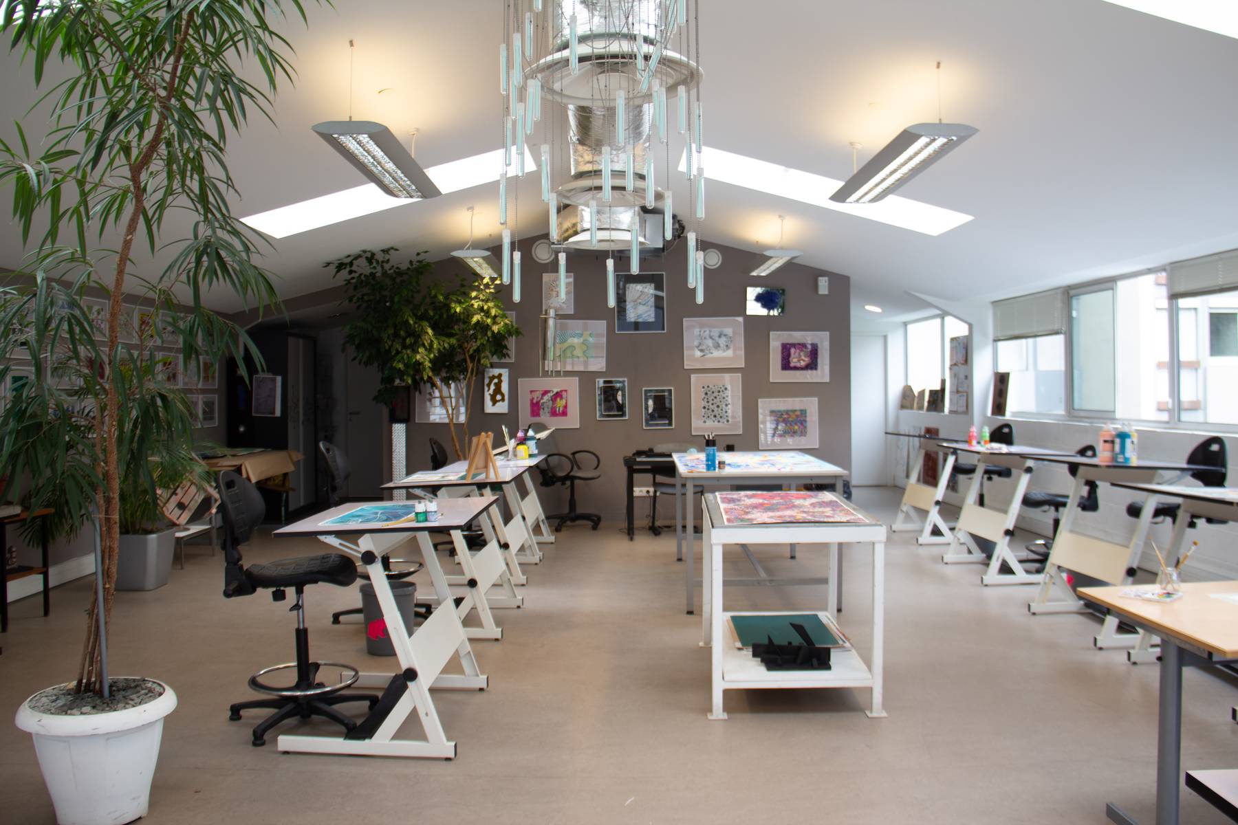 Dans une pièce lumineuse, entourée de verrières, les artistes dessinent, peignent, inventent, griffonnent, esquissent… ils travaillent côte à côte et s’entraident mais chacun poursuit son propre processus pour développer un style distinct et marqué. La monitrice les accompagne tout au long de leur processus de création et les aide à appréhender les questions pratiques et techniques.