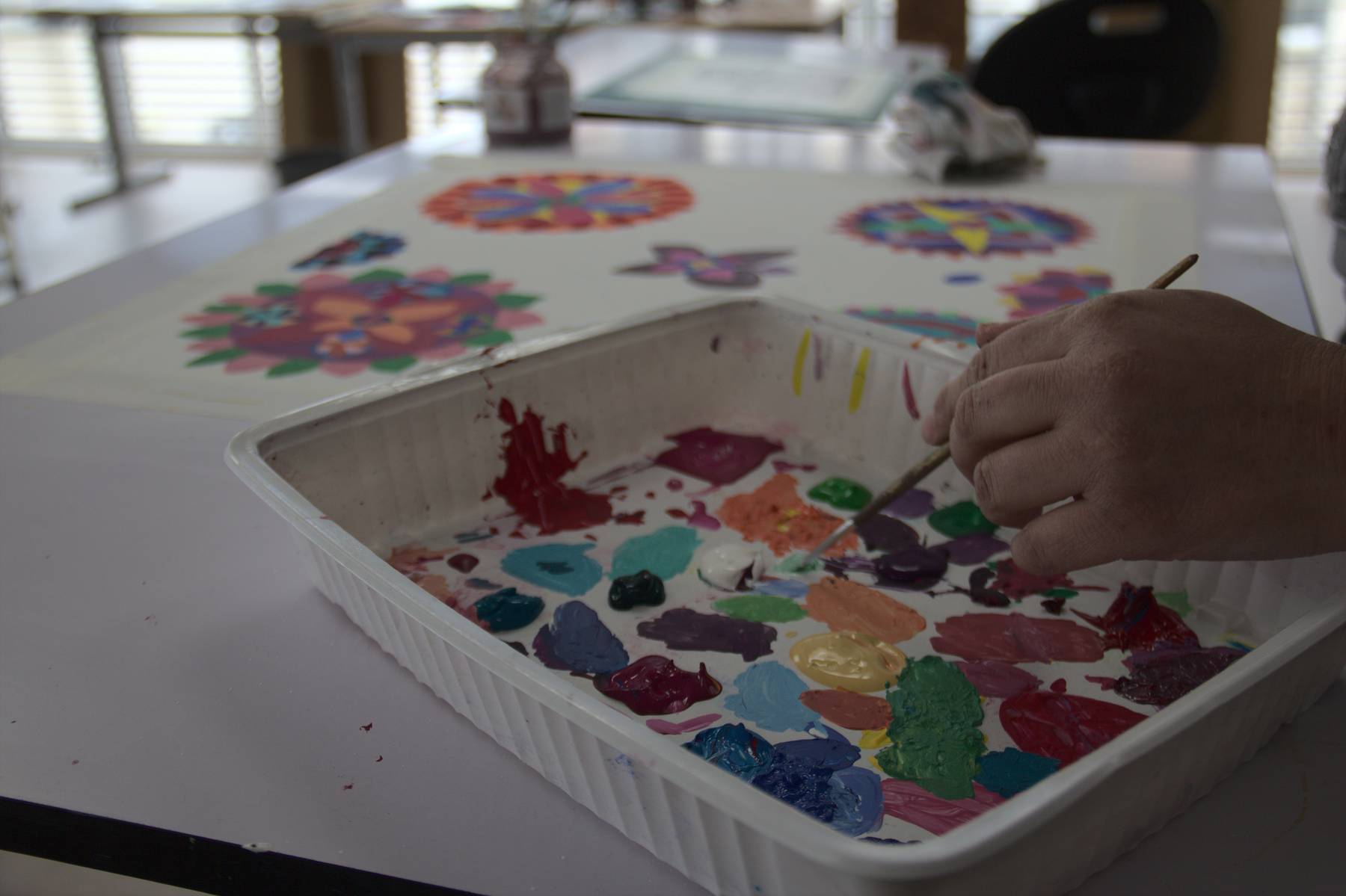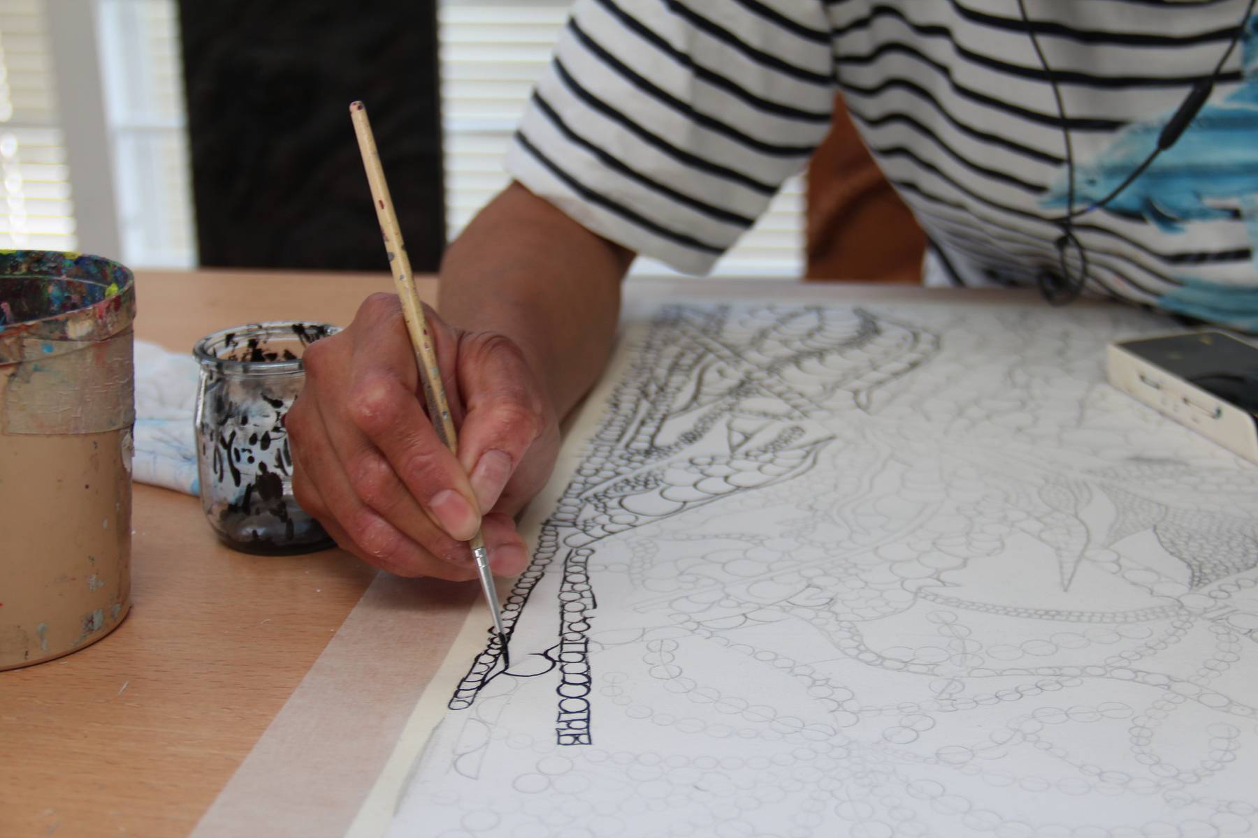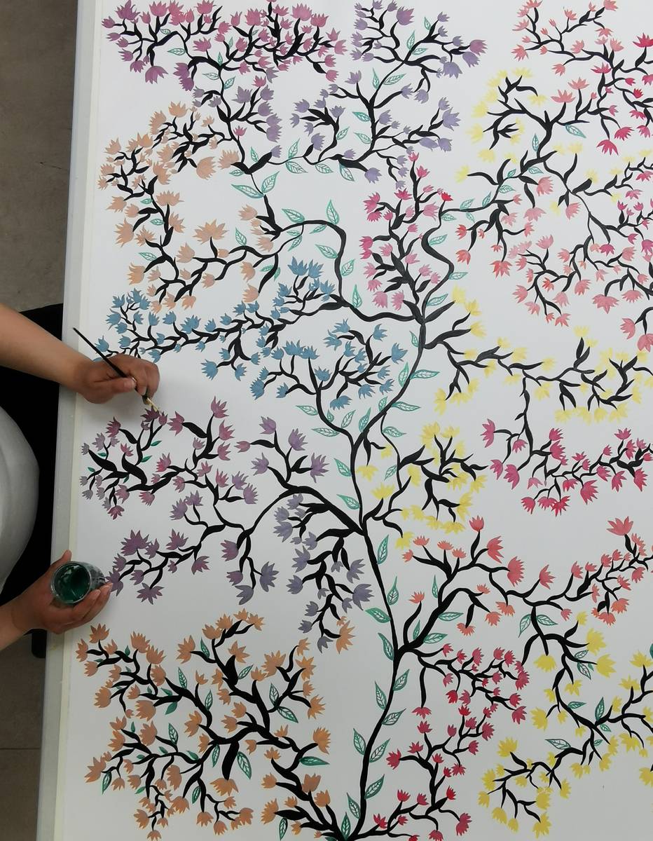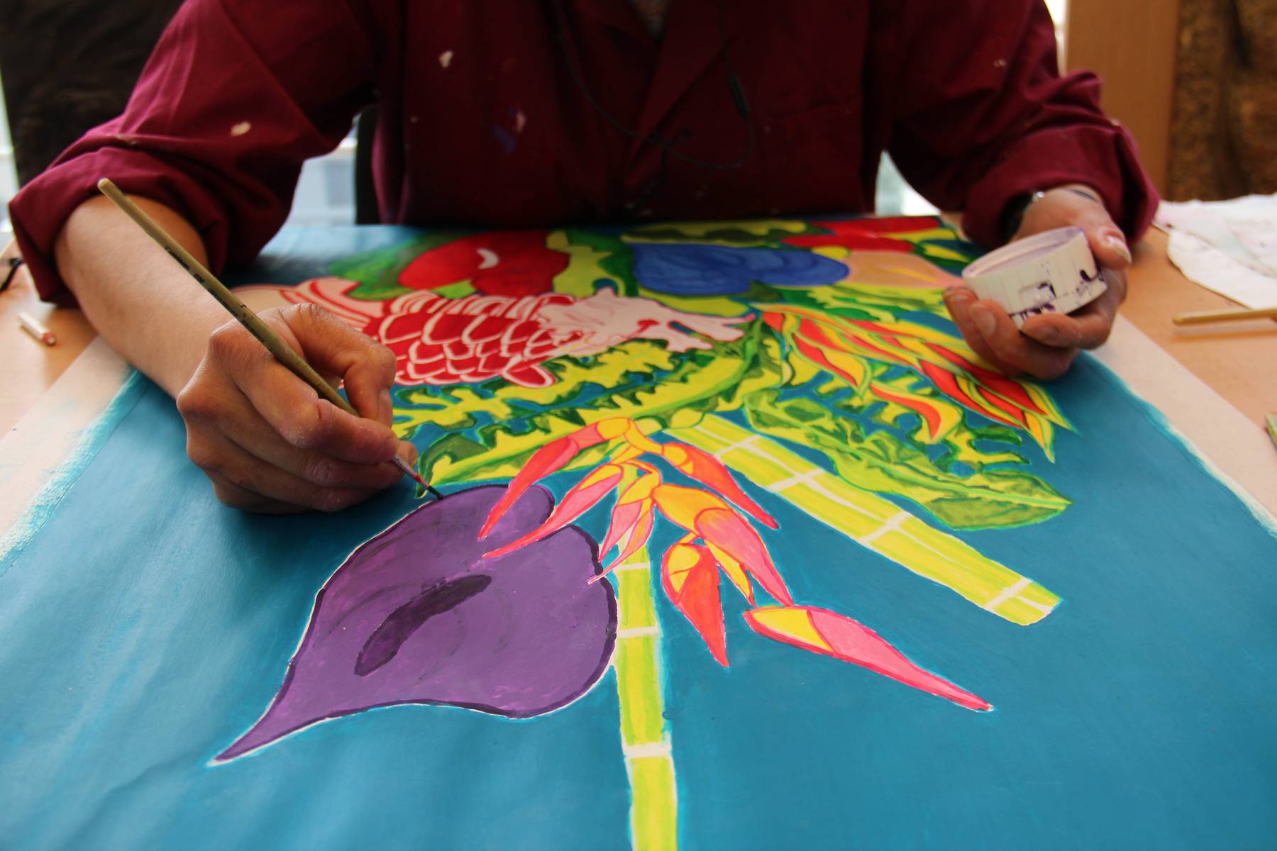 Dans une pièce lumineuse, entourée de verrières, les artistes dessinent, peignent, inventent, griffonnent, esquissent… ils travaillent côte à côte et s’entraident mais chacun poursuit son propre processus pour développer un style distinct et marqué. La monitrice les accompagne tout au long de leur processus de création et les aide à appréhender les questions pratiques et techniques.