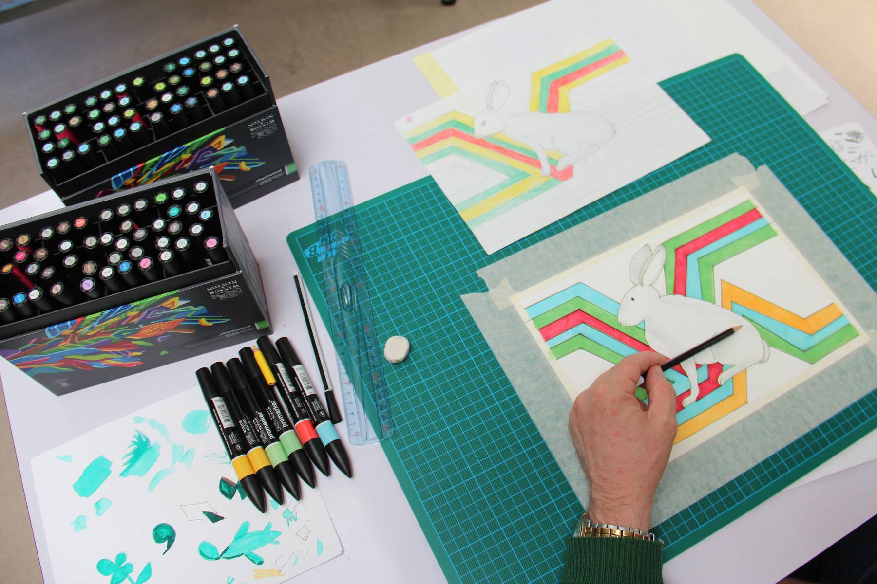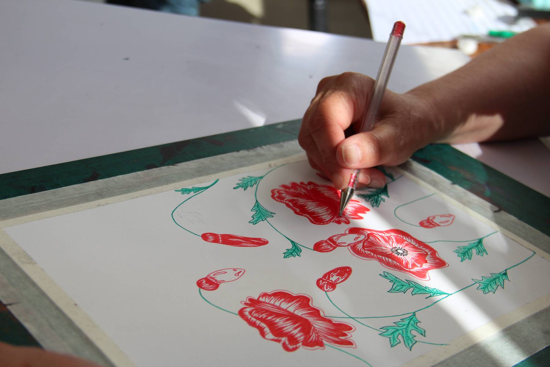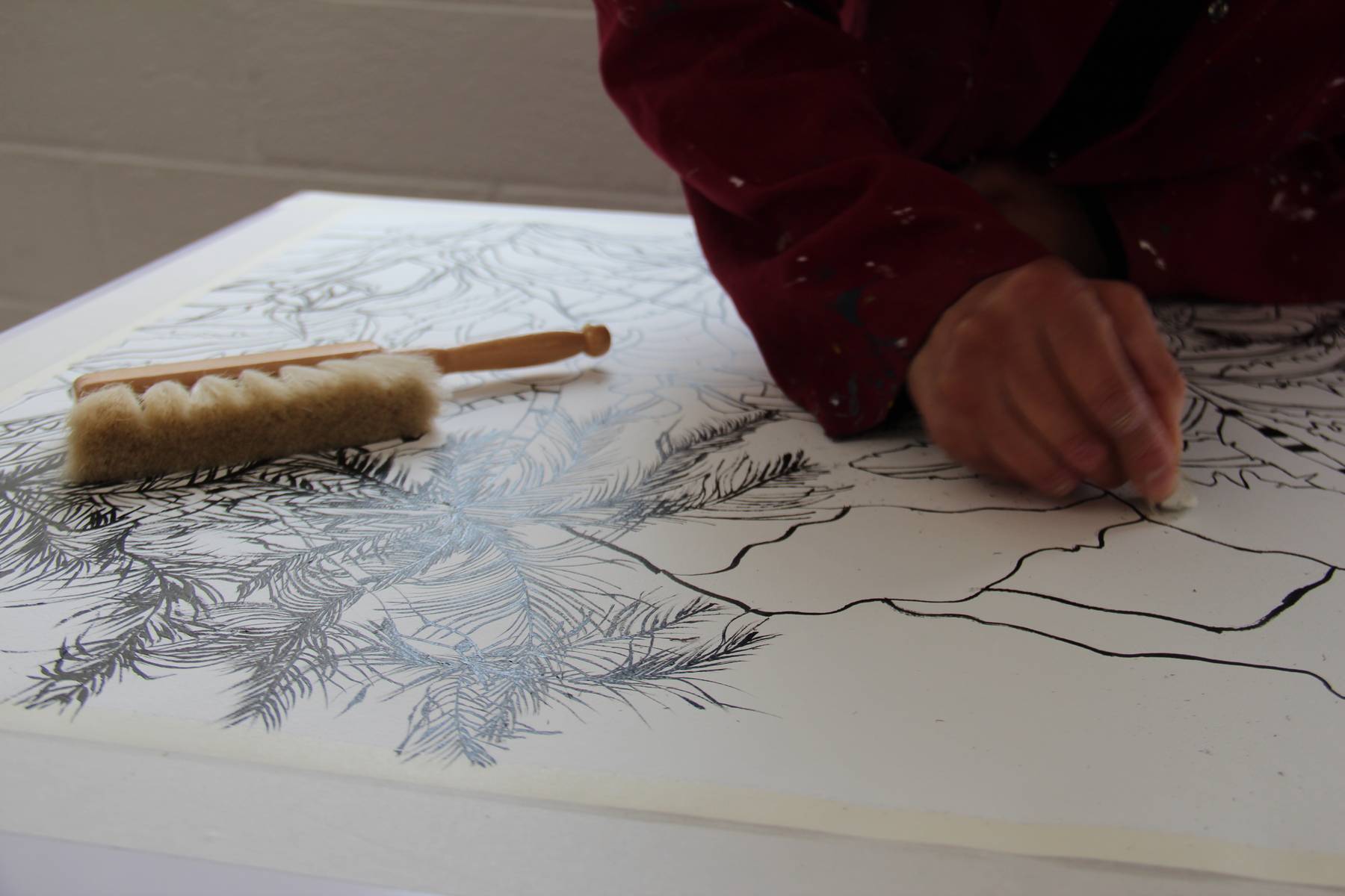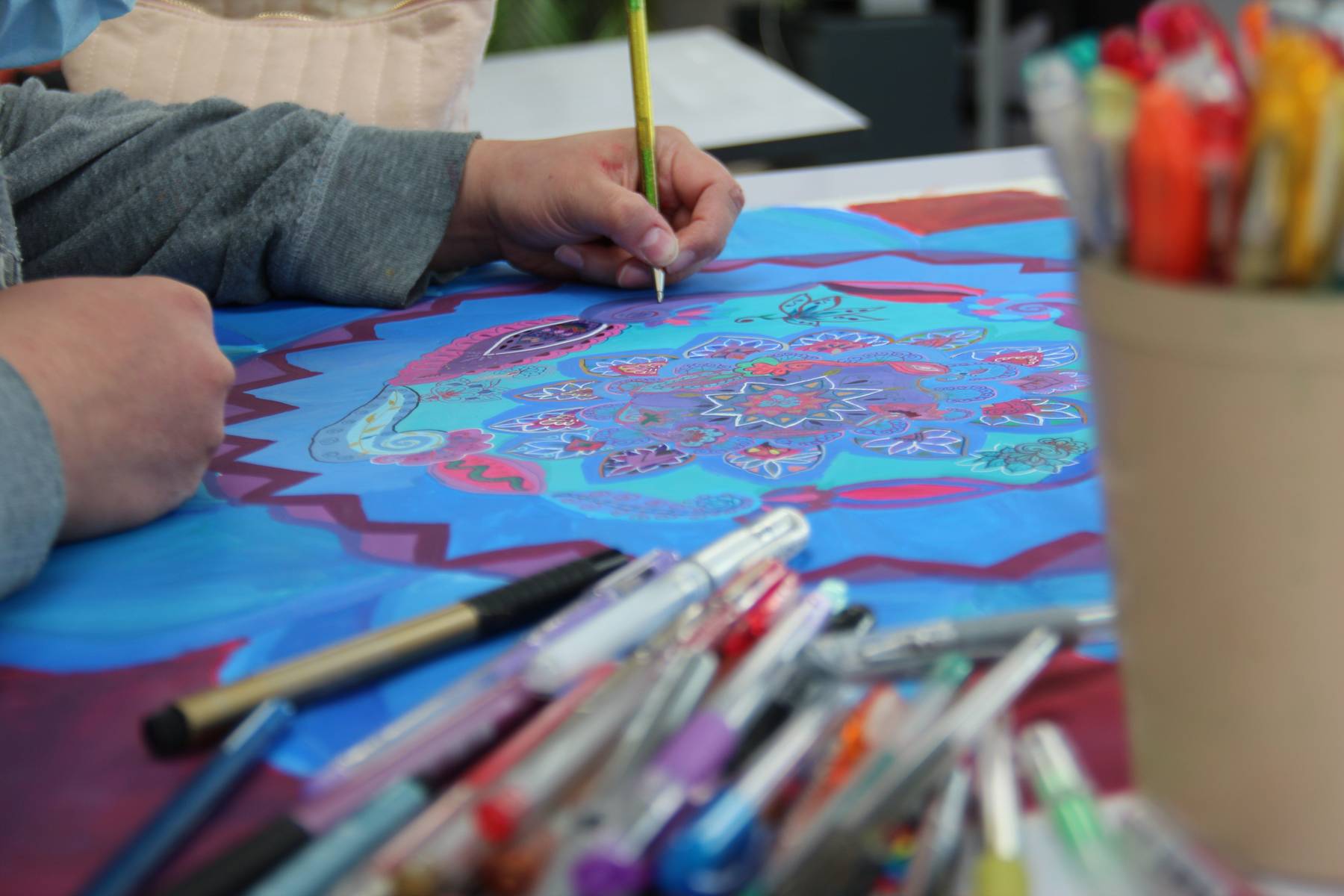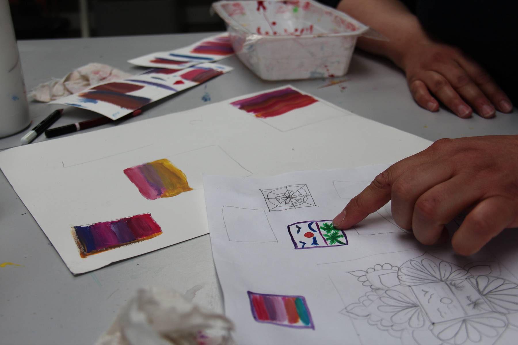 Dans une pièce lumineuse, entourée de verrières, les artistes dessinent, peignent, inventent, griffonnent, esquissent… ils travaillent côte à côte et s’entraident mais chacun poursuit son propre processus pour développer un style distinct et marqué. La monitrice les accompagne tout au long de leur processus de création et les aide à appréhender les questions pratiques et techniques.