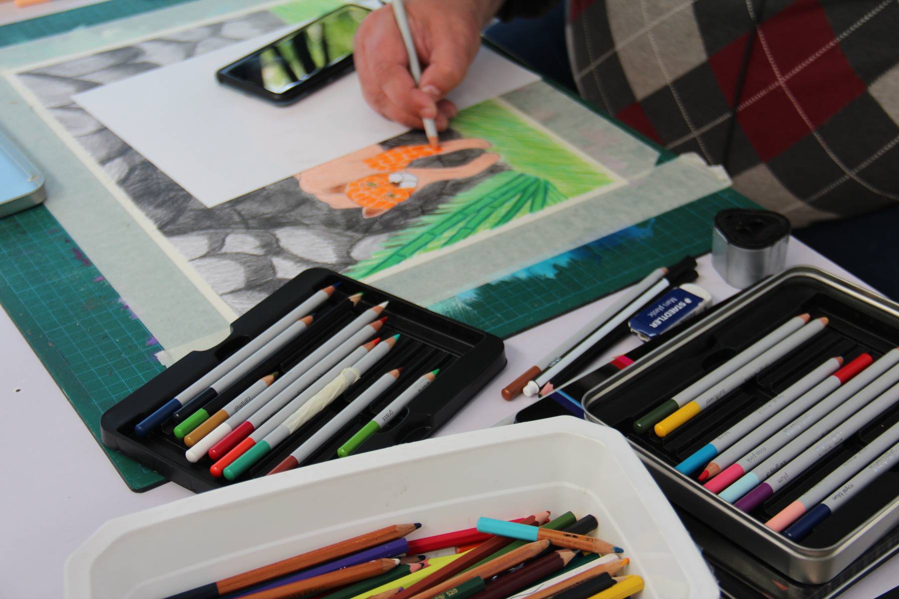 Au sein du collectif, chacun expérimente et travaille à son rythme, en fonction de ses savoir-faire, de ses inspirations et de ses envies. Les formats sont multiples, tout comme les matériaux et outils utilisés. Les supports peuvent être très petits mais aussi mesurer jusqu’à plus d’un mètre de long. Les matériaux à disposition sont variés : peinture acrylique, peinture aquarelle, encre de Chine, crayons, pastels secs et gras, fusains, encre à dessiner, etc.